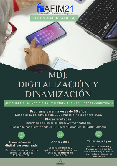 El 16 de OCTUBRE DE 2025 empezamos el programa gratuito para personas mayores de 55 años cofinanciado por la Consejería de  Inclusión Social, Juventud, Familias e Igualdad de la Junta de Andalucía y Asociación AFIM21.